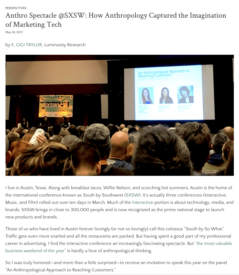 Read my description and reflections of being on a SXSW panel in this essay. “Anthro Spectacle @SXSW: How anthropology Captured the Imagination of Marketing Tech” was published in the EPIC blog on March 28, 2019.