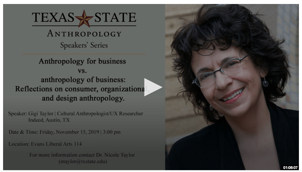 Speakers: Patricia Sunderland (Cultural Research & Analysis, Inc.), Matt Artz (Cloudshadow), Marcel Rosa-Salas (University of Illinois at Chicago), and Gigi Taylor (Indeed). The recorded video of our panel is available is available here. Here is a preview of the panel which appeared in the UNT alumni magazine. Here is the description of the panel in the NAPA (National Association for the Practice of Anthropology) announcements.